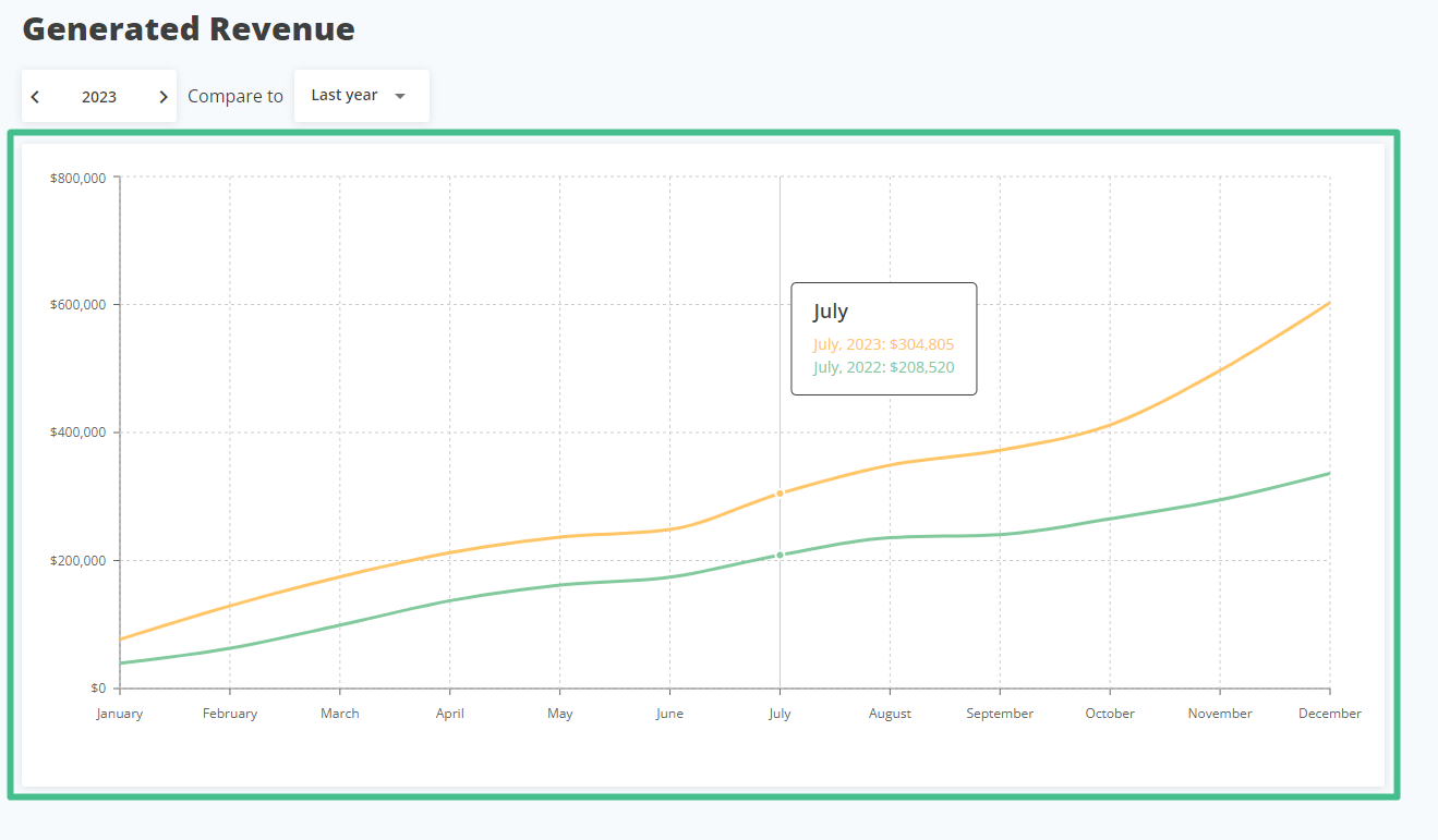 At the heart of the Generated Revenue Report is a user-friendly line chart. The Y-axis represents monetary revenue, while the X-axis displays all 12 months of the year. Two lines are featured in the chart:
