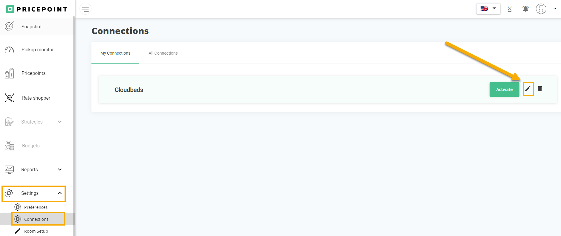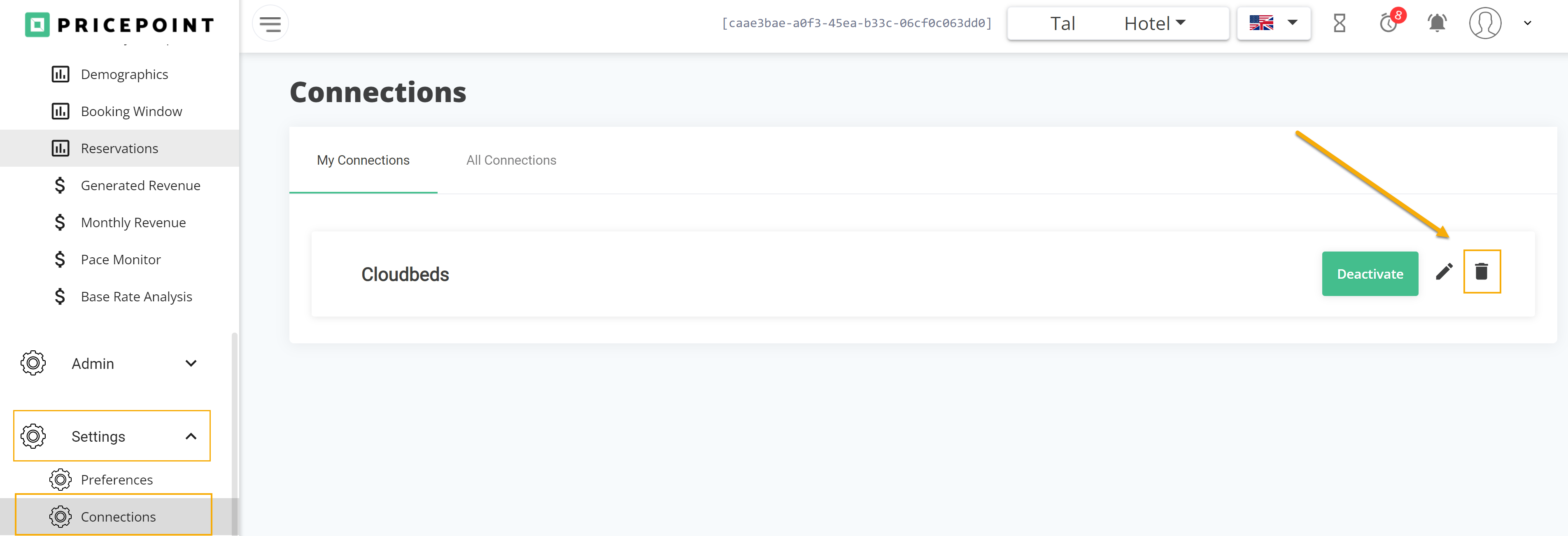 If you want to disconnect Pricepoint from Cloudbeds and remove Pricepoint from your Marketplace connections, please navigate to SETTINGS / CONNECTIONS and use the trash icon. After clicking on the icon, the connection will be immediately disabled.