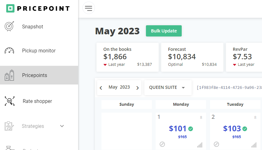 The blue font, on the contrary, indicates that the price recommendation is lower by -35% than your BASE RATE (STARTING PRICE). It suggests that Pricepoint cannot lower prices more and if you wanted to keep discounting you'd have to change the base rate.